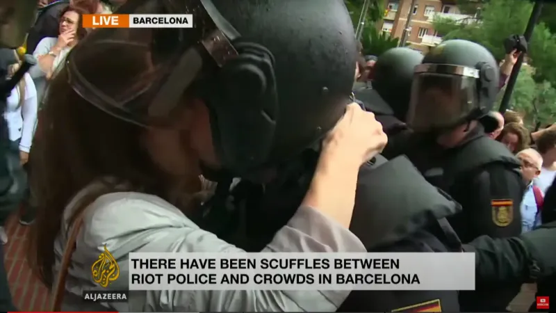 Так вот, один из этих сотрудников в понедельник подал письменную жалобу в 7-й следственный суд Барселоны. В жалобе полицейский утверждает, что 1 октября 2017 года в Барселоне он подвергся поцелую в губы со стороны неустановленной женщины, причем его поцеловали "удивительным, неожиданным, внезапным и неконсенсуальным" образом, что принесло ему крайние эмоциональные и физические страдания. А не сообщал он об этом в течение шести лет, потому что не мог раздобыть видеозапись, доказывающую факт удивительно, неожиданного, внезапного и неконсунсульного. А теперь раздобыл - это запись телеканала Aljazeera.