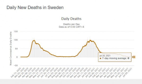 Каковы результаты высмеиваемой шведской политики невмешательства? Данные показывают, что 7-дневное скользящее среднее число смертей от COVID вчера было равно нулю. И вот уже неделю он находится на нуле.