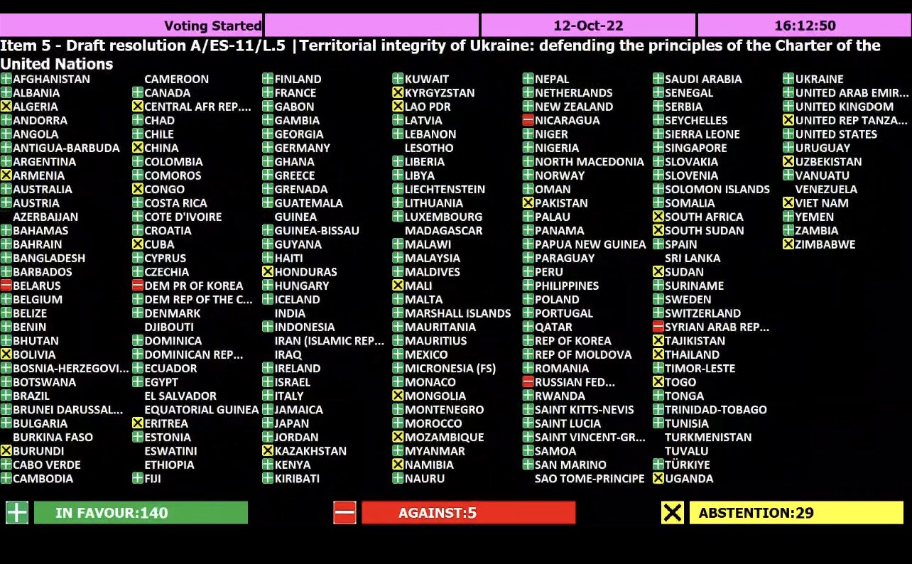 Лишь четыре страны-изгоя — КНДР, Белоруссия, Сирия и Никарагуа — поддержали РФ при голосовании на Генассамблеи ООН резолюции с осуждением аннексии украинских территорий. За резолюцию высказалось 143 государства, еще 35 воздержались.