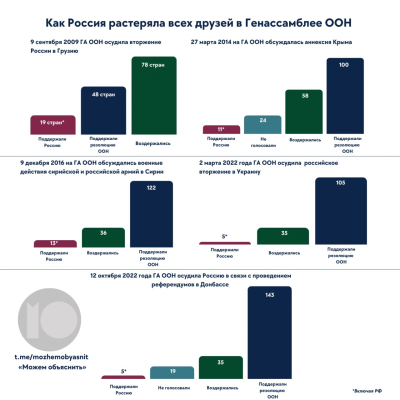 Ну, давайте посмотрим, что там было со вчерашним голосованием в ООН, и как менялась поддержка России с сентября 2009 года по вчерашний день. Ну и мы помним, как совсем недавно главы Китая и Индии немного повозили Путина физиономией по столу на саммите ШОС в Самарканде, откуда он вернулся конкретно "опущенный" и через пару дней объявил могилизацию, хотя до этого что Песков, что все его пропагандоны дружно заверяли недорогих россиян в том, что никакой мобилизации не будет.