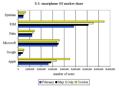 Интересно, какое соотношение у нас? В США-то на первом месте RIM (BlackBerry), а у нас он практически вообще не используется. У нас наверняка доля Symbian намного больше.