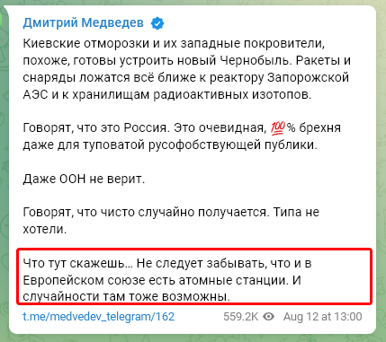 Российская армия резместила непосредственно на территории самой Запорожской АЭС боеприпасы и военную технику. Запорожская АЭС самая крупная АЭС в Европе. Вот текст который выдал один высокопоставленный русский алкоголик в предыдущие годы президент ватной недо империи.