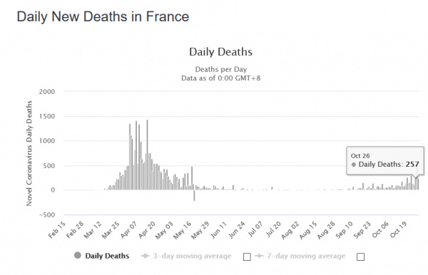 Тут Францию "упрекают" за введение мер при средненедельном уровне смертности 260 погибших в день (в Германии ещё меньше, 55). В США этот уровень уже давно не опускается ниже 700-800, даже на минимуме в июле было около 500.