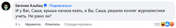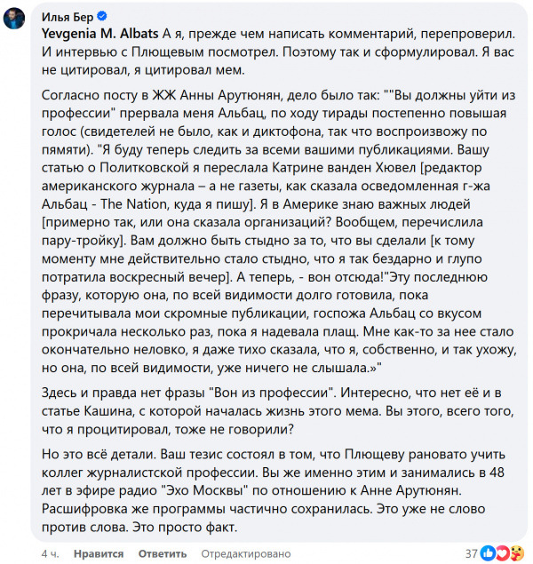 Затем Илья Бер напомнил Альбац ее собственные вопли про "Вы должны уйти из профессии" журналистке Анне Арутюнян. После чего Илья Бер был немедленно забанен Альбац - видимо, с целью поддержания дискуссии.