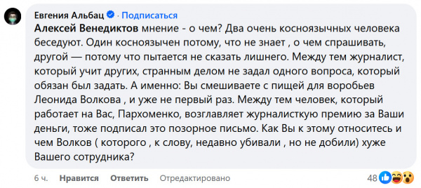 Тут в комменты явилась Е. Альбац с абсолютно хамским (ей это временами свойственно) комментарием.