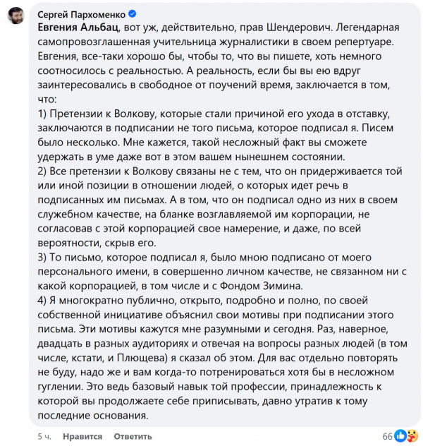 Затем она пояснила, что вызвало ее сиятельный гнев. Альбац, оказывается, за Волкова стало больно и обидно. И на Пархоменко заодно наехала.