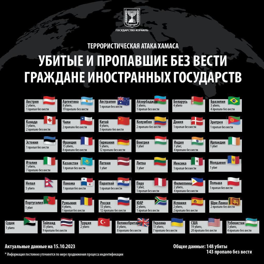 Немного офф-топ. Вот разбивка по странам среди иностранцев, пострадавших от Хамаса. (Как считалось двойное и больше гражданство, не знаю):