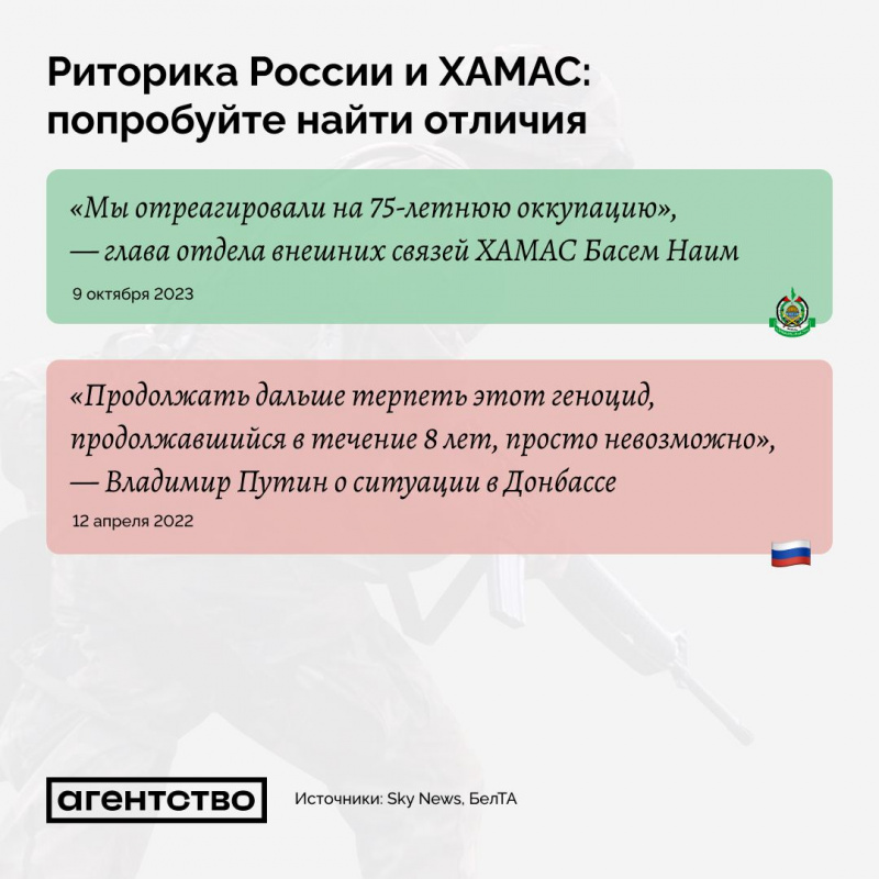 То, что нынешние заявления ХАМАС почти один в один слизаны с бесконечного вранья Путина и его шайки-лейки - отметили многие. Впрочем, кто там у кого учился - еще вопрос: Латынина, например, считает, что хамасовцы всегда себя так вели, и что это Путин учился у ХАМАС, а не наоборот. Но все просто один в один - в ТГ "Агентство Новости" сделали классную подборку.