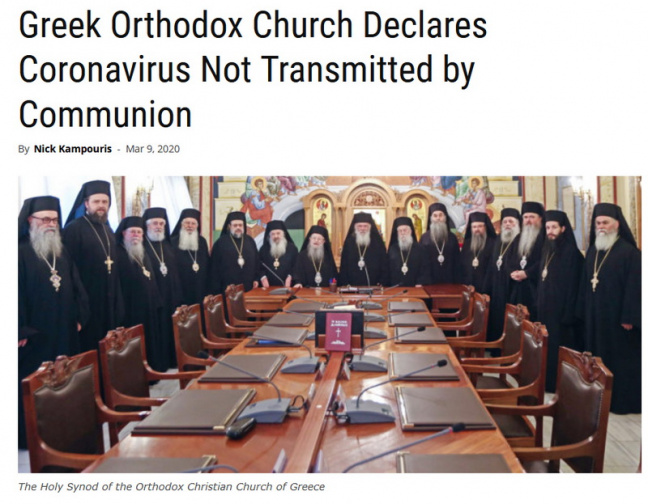 Священный Синод Православной Церкви Греции опубликовал в понедельник заявление, в котором говорится о вспышке коронавируса Covid19, утверждая, что Святое Причастие не передает вирус. (Отсюда.)