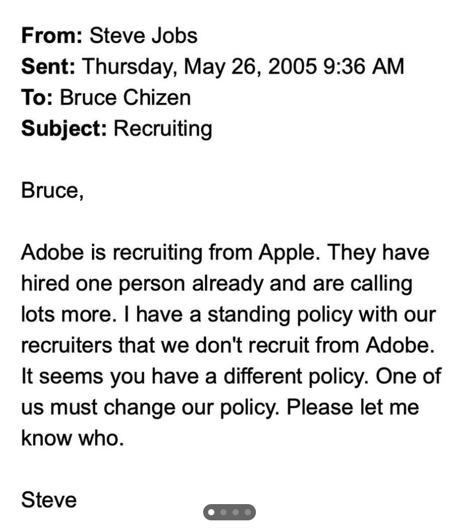 В 2010-2013 годах в Штатах был большой скандал по поводу "соглашений о cold calls" между компаниями Apple, Google, Pixar и другими, ограничивающих "переманивание" работников друг у друга. Закончилось представительским иском, улаженным досудебным соглашением. А незадолго до смерти Джобса в прессу попала его переписка с кем-то из топов MS по тому же поводу.
