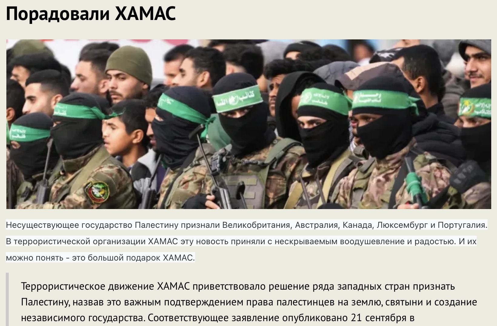Несуществующее государство Палестину признали Великобритания, Австралия, Канада, Люксембург и Португалия. В террористической организации ХАМАС эту новость приняли с нескрываемым воодушевление и радостью. И их можно понять - это большой подарок ХАМАС.