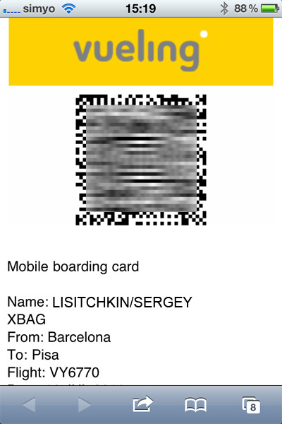 Видел такую штуку в Штатах, оказалось, что в Испании это тоже уже работает. Если вам не надо сдавать багаж и вы заказываете определенное место в самолете, то уже нет необходимости стоять в очереди к стойке регистрации. Заходите на сайт, делаете онлайновую регистрацию. Это раньше тоже работало, только посадочный талон надо было заранее распечатать. Сейчас и это не надо делать. Вбиваете номер телефона, на него приходит SMS со ссылкой. Открываете ссылку - там ваш посадочный. Показываете его прямо на телефоне - в аэропорту есть специальный сканер. И все дела. Вот мой.