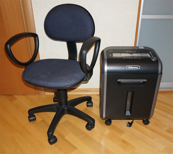 По размеру этот шредер - чуть больше обычной офисной корзины: вот он в сравнении с офисным стульчиком. К тому же его снабдили колесиками, благодаря которым шредер может ездить туда-сюда, прям как стульчик, но я бы не советовал садиться на шредер и пытаться кататься на нем по офису: конечно, ценную информацию в виде каких-то частей тела он в любом случае не уничтожит, но лучше все-таки шредер использовать по прямому назначению, благо он это делает быстро и эффективно.