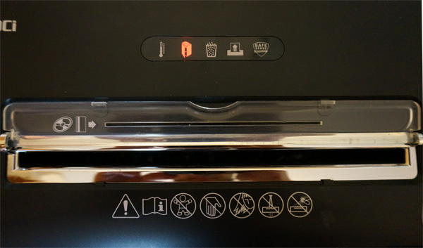 В данной модели от заторов защищает специальная технология 100%JamProof. Работает она умно и интеллектуально: если в приемник подается слишком большая пачка бумаги, шредер специальным индикатором покажет, что пачку нужно уменьшить, а без этого просто не будет производить резку. А если бумага смята, то шредер начнет ее обрабатывать, комбинируя прямую протяжку с реверсной, так что никаких заторов также не будет. Смотрится это, кстати, очень забавно - шредер проявляет некую интеллектуальность в обработке.