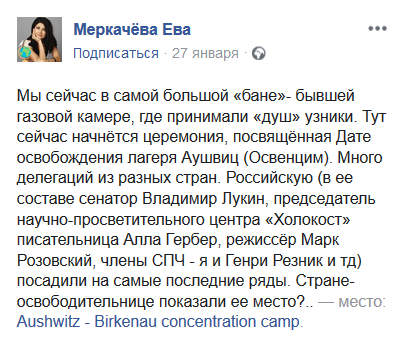 Осспади... Заметка Алекса про тупость очередной бабенки, которая возмущена, что российскую делегацию не посадили в первых рядах и не понимает, что если бы посадили, это бы понималось, что в случае чего, она была бы отправлена в печь первой. Вот и всё.