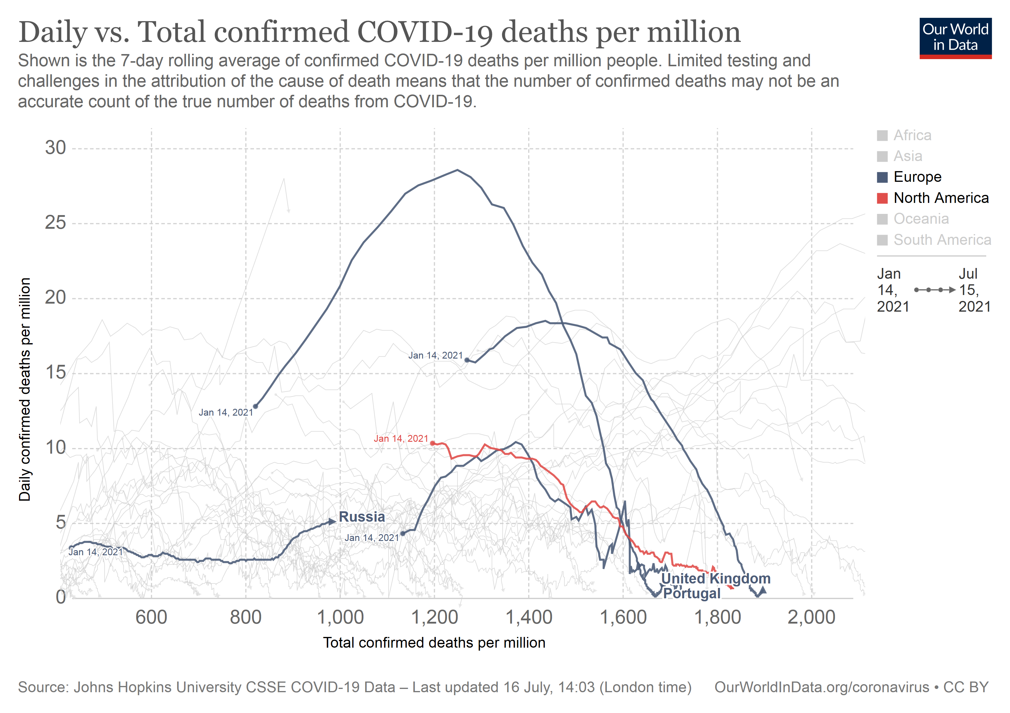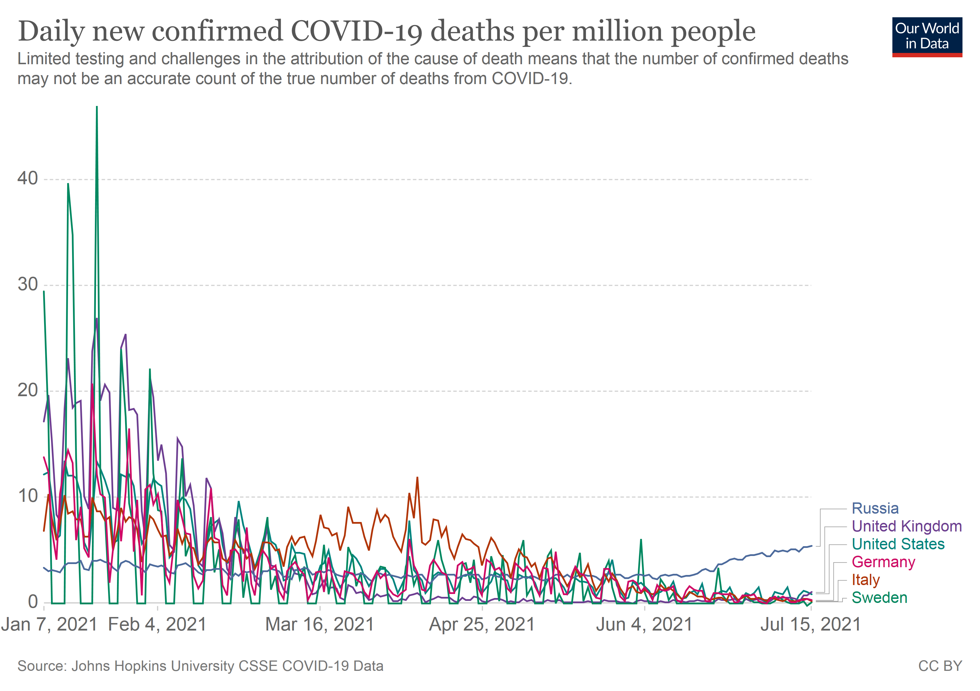 Ну а про "несколько месяцев назад", так тогда и вакцинации по сути ещё не было, она только последние 1,5-2 месяца ощутимый результат начала показывать. Речь-то именно о вакцинации. В странах, где привит большой процент населения, смертность с продвижением вакцинации падала и сейчас на очень низких значениях, а вот в России она выросла в 2 раза за месяц и уже давно побила собственный рекорд, поставленный зимой.