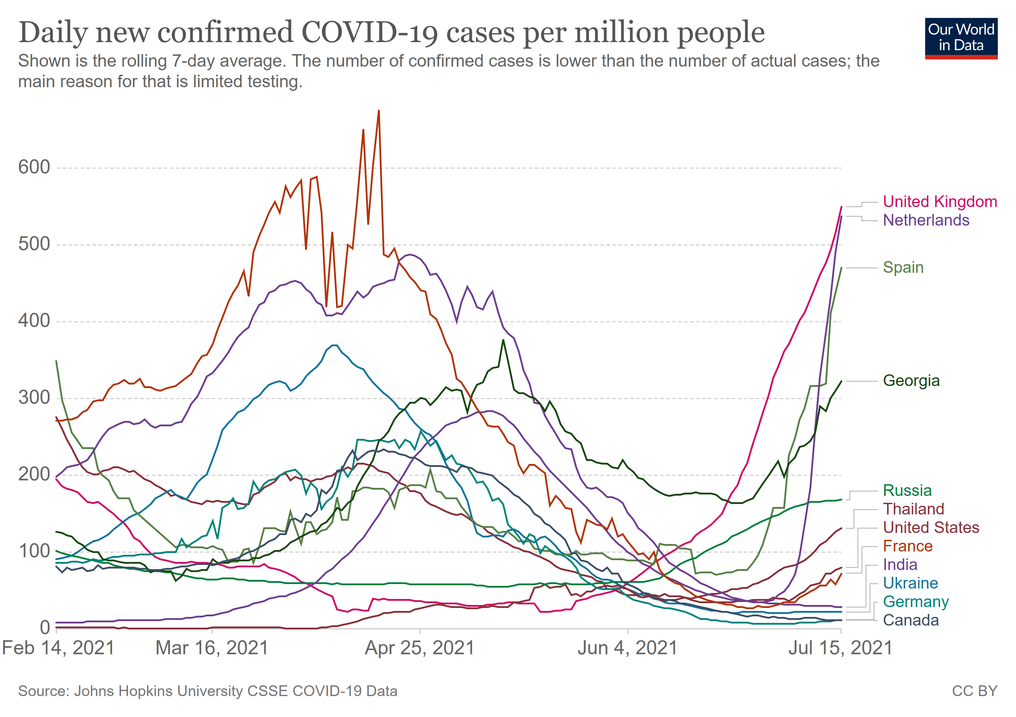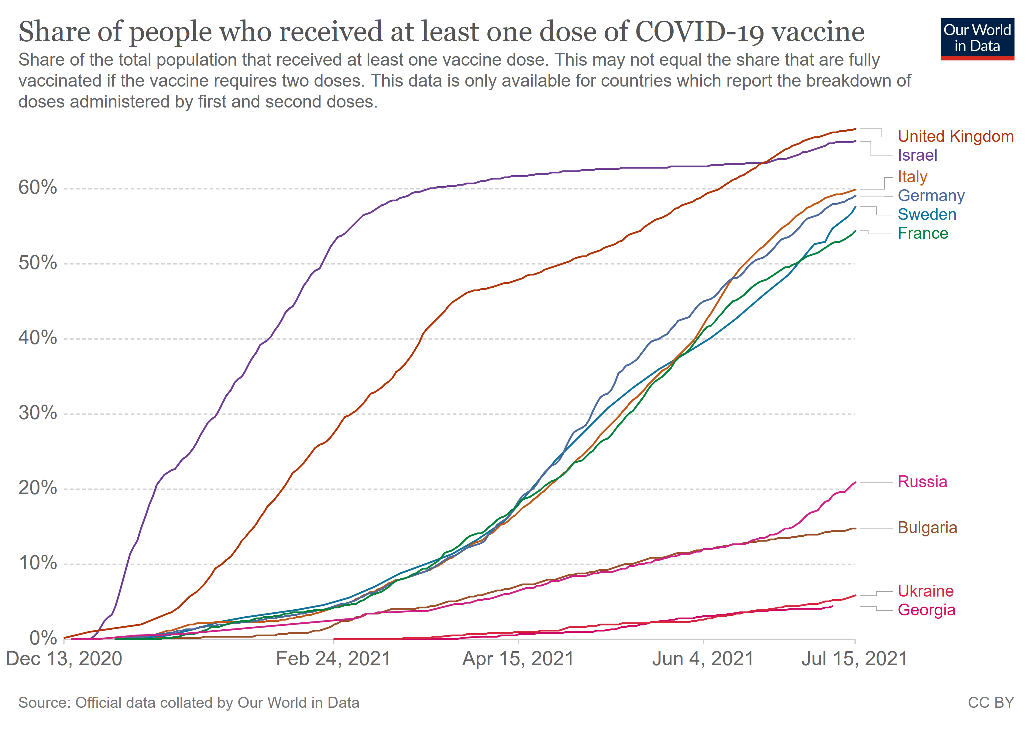 В Украине хорошая ситуация исключительно потому, что дельта ещё полноценно не дошла. Видимо, до каникул дойти не успела, а сейчас школы закрыты, люди больше на природе тусуются, по селам разъехались. Но со временем и в Украине будет рост.