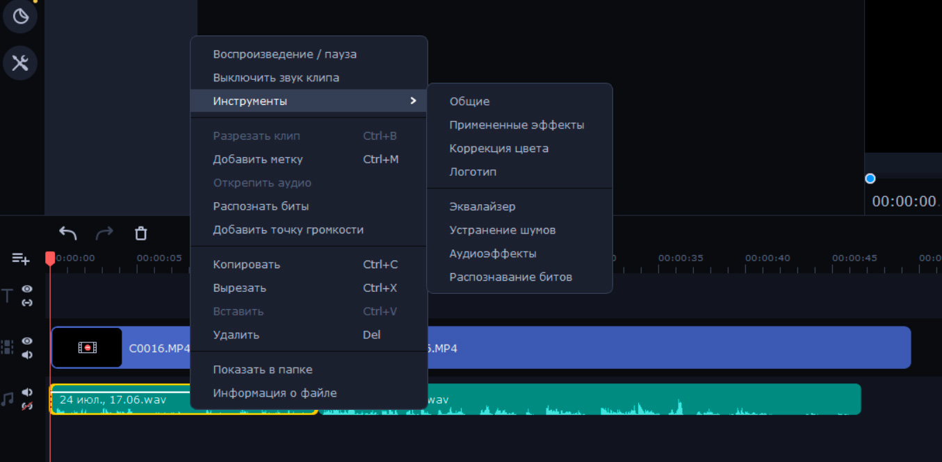 • замена аудиодорожки у видео на записанную отдельно (что интересно, Movavi такое напрямую делать не умеет, только через экспорт ролика);