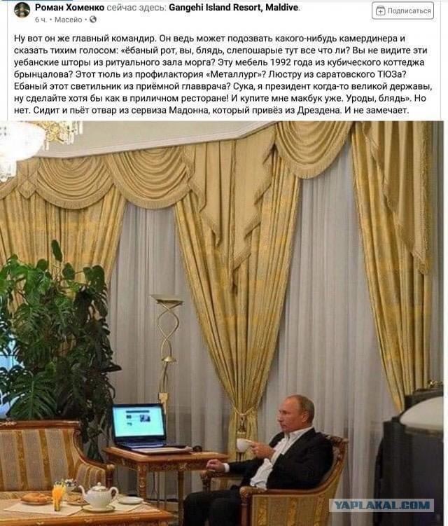 Куда идут наши налоги ?! Сюда бы что-нибудь имперское, железный трон какой-нибудь... А вместо этого кажется, что на фото не хватает поролоновых тапок и пузырька с валокордином.