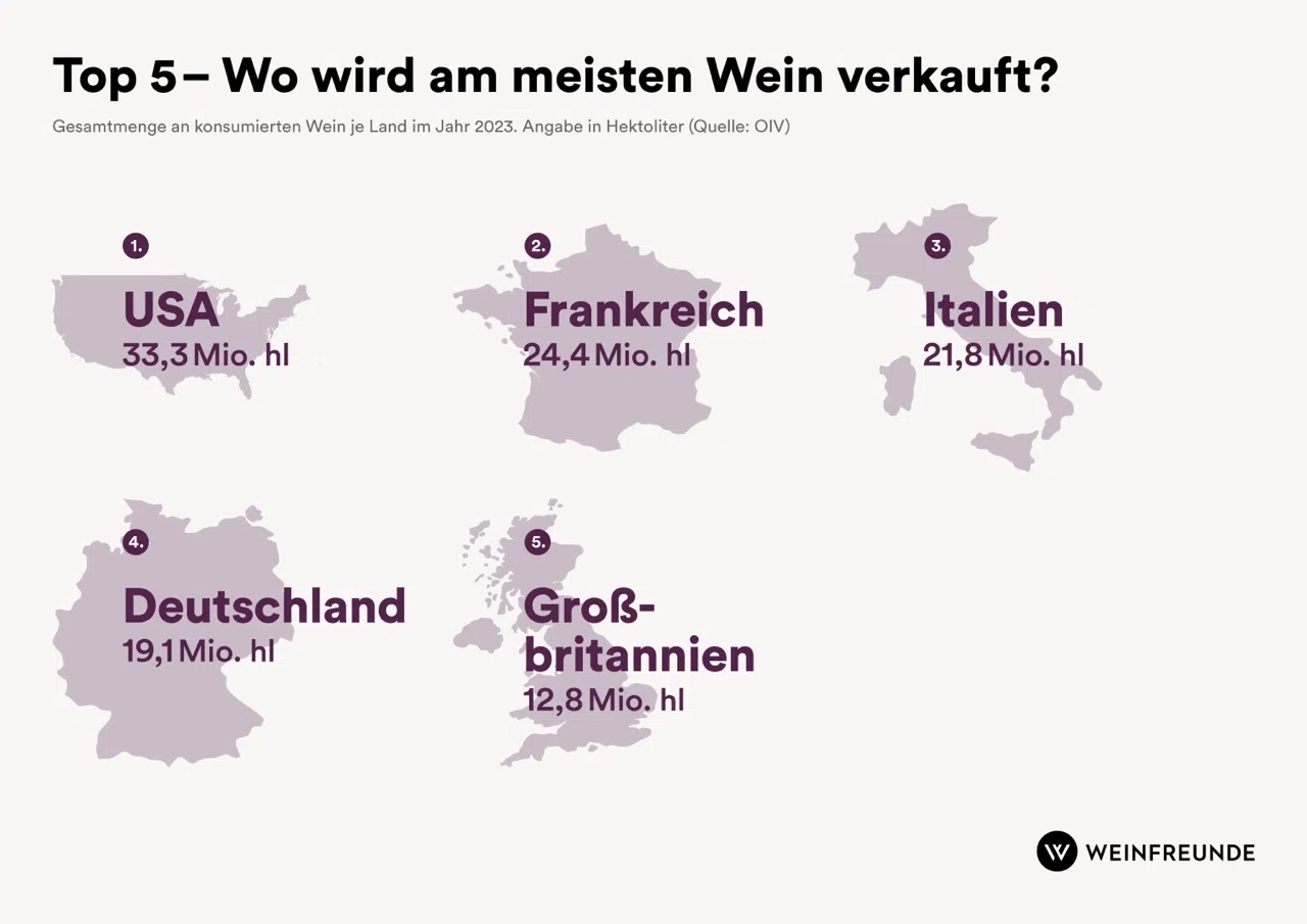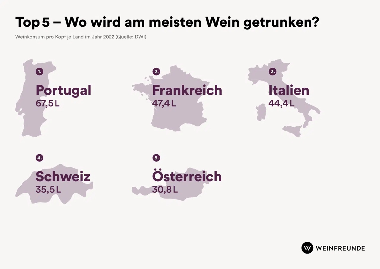 Статистика 22-23 года ставит на первое место Португалию с 67,5 л на душу населения. Затем идут Франция, Италия, Швейцария и Австрия. Германия на 6 месте.