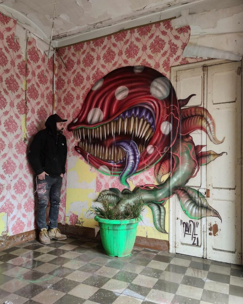 Барселонский художник Давид Лосано (David Lozano) рисует впечатляющие граффити, изображающие разнообразных известных киноперсонажей, в заброшенных зданиях города. Причем он не просто рисует граффити, он их еще и искусно встраивает в помещение и делает там соответствующие инсталляции.