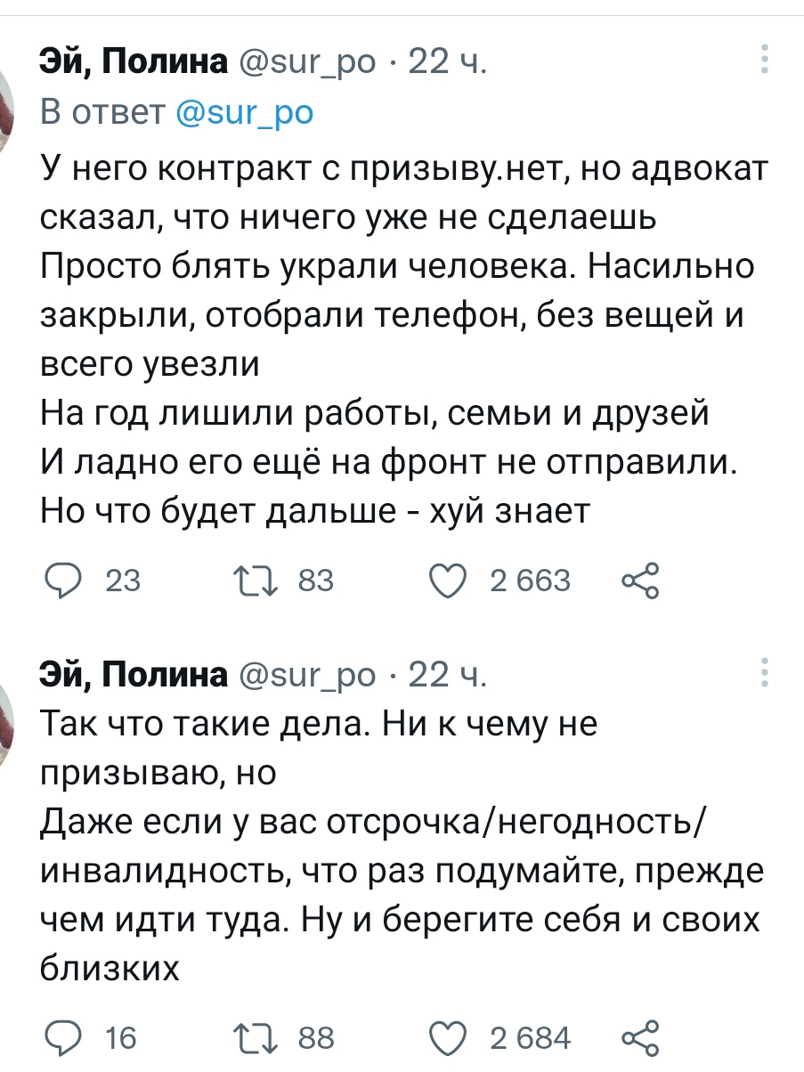 По словам Кривенко, в его группу поступают уже десятки таких сообщений. Вызов в военкомат служит дополнительным каналом вербовки: отслужившим мужчинам разного возраста в военкомате предлагают заключить контракт, и идти на войну с Украиной, заманивают деньгами. Некоторым такой мотивации хватает для заключения контракта, говорит Кривенко.