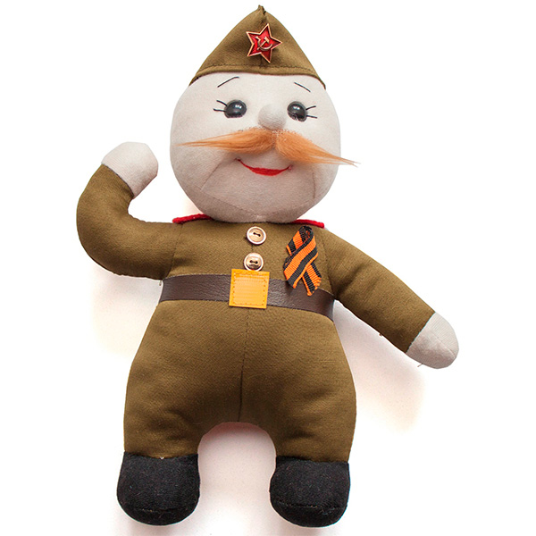 Мягкая кукла "Ветеран" торговой марки "Бока" стилизована под участника войны, одетого в соответствующую форму с пилоткой на голове. К груди приколота георгиевская лента - символ великой Победы. Игрушка сделана из приятного на ощупь, качественного текстиля. Кукла будет напоминать о подвигах наших дедов и способствовать повышению патриотического духа ребенка. (Отсюда.)