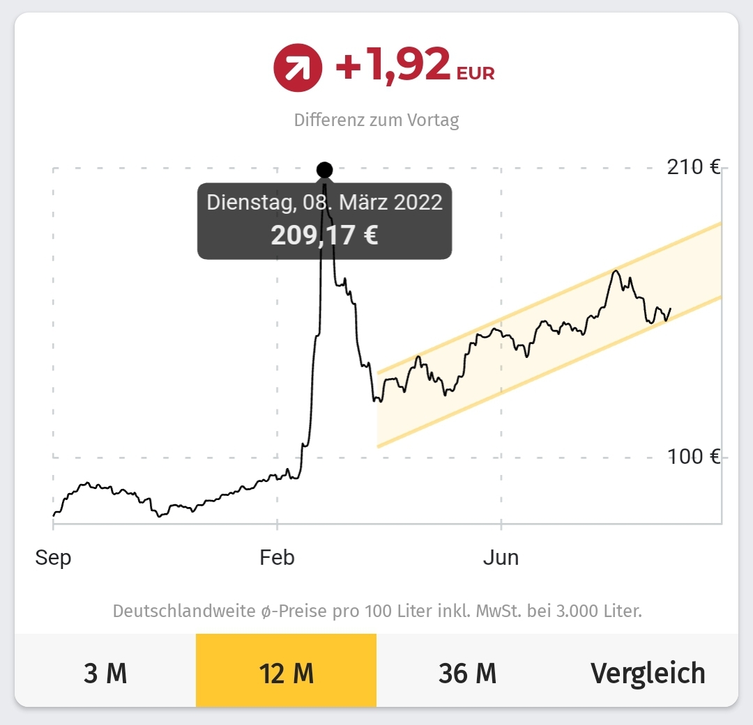 В Германии бутылка подсолнечного Thomy 0,75л - 3,99 евро (5,32€/л) прямо сейчас, весной-летом, когда были пустые полки, дефицит и ажиотаж, доходило где-то до 8-9€/л.