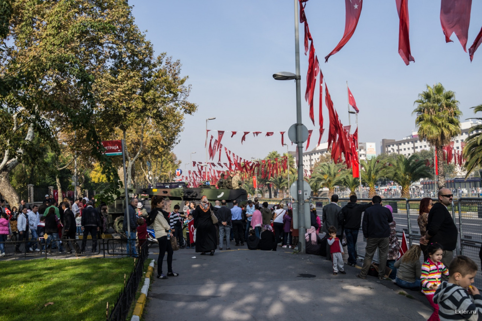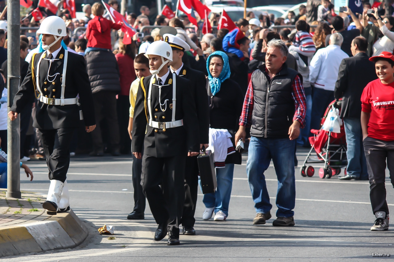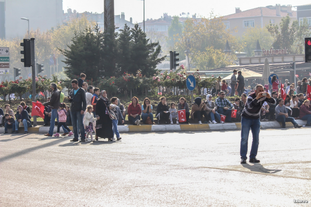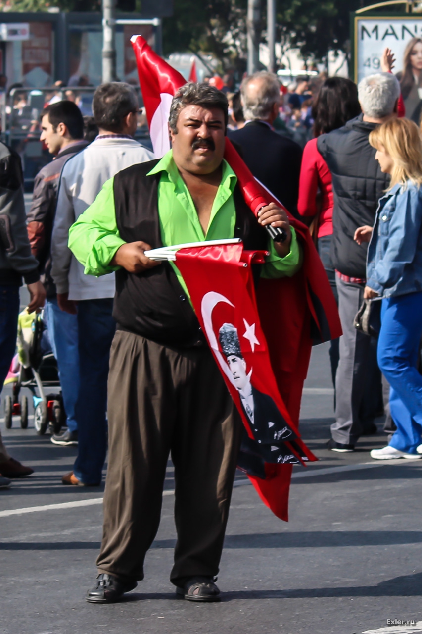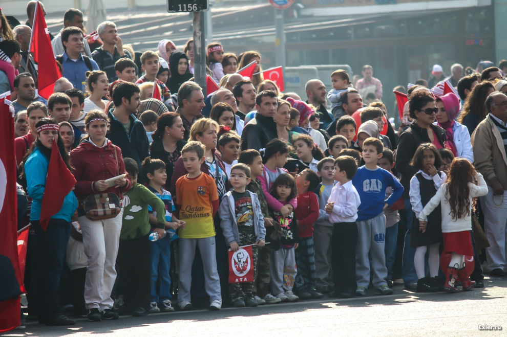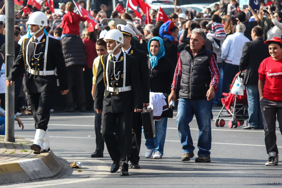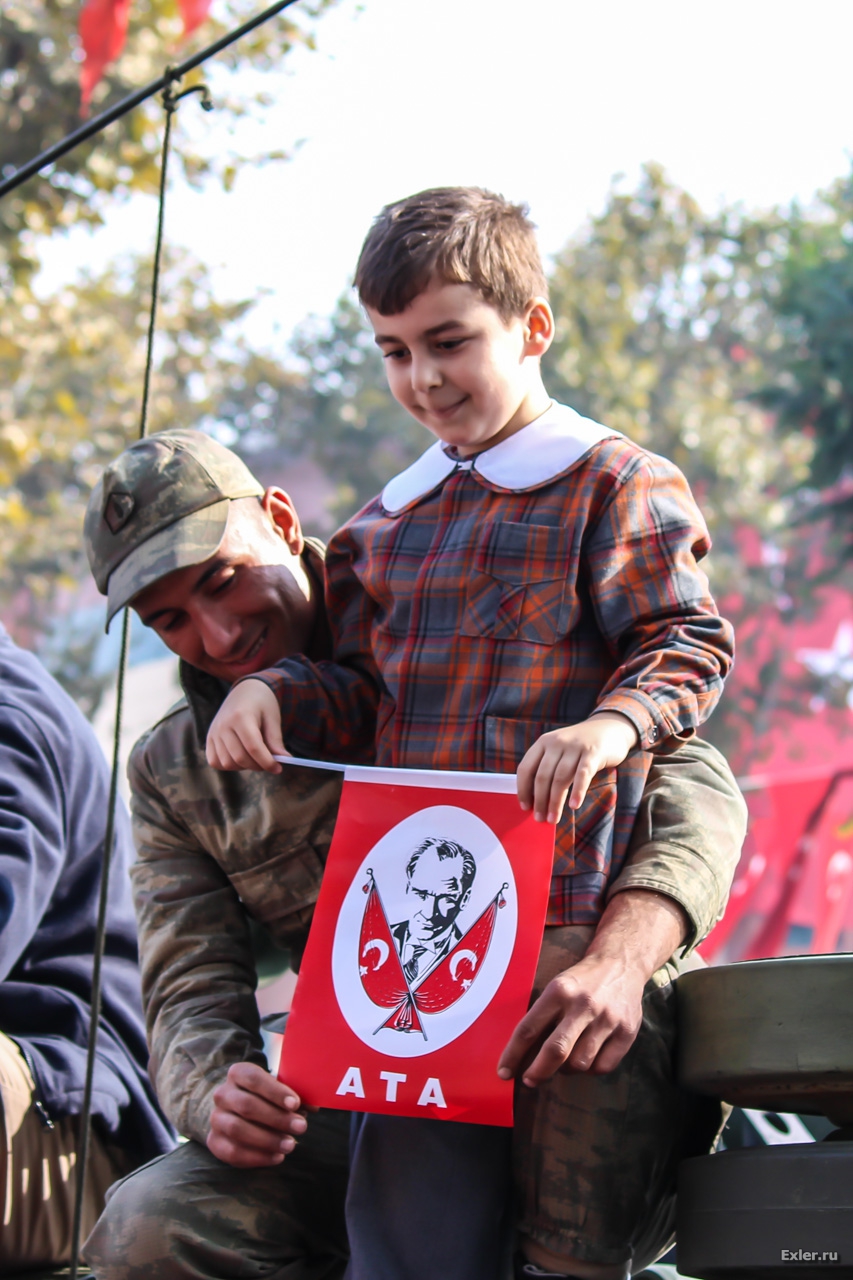 Теперь впечатления о праздновании. Сам парад не особенно впечатлил, но люди там собирались явно далеко не только для того, чтобы посмотреть на шествие военных и школьников. Они приходили целыми семьями, почти все несли самые разнообразные национальные символы с турецким флагом и портретом Мустафы Кемаля Ататюрка - создателя Турецкой Республики. Обстановка была очень веселая, доброжелательная. Полицейские также вели себя очень доброжелательно и общались с собравшимися.