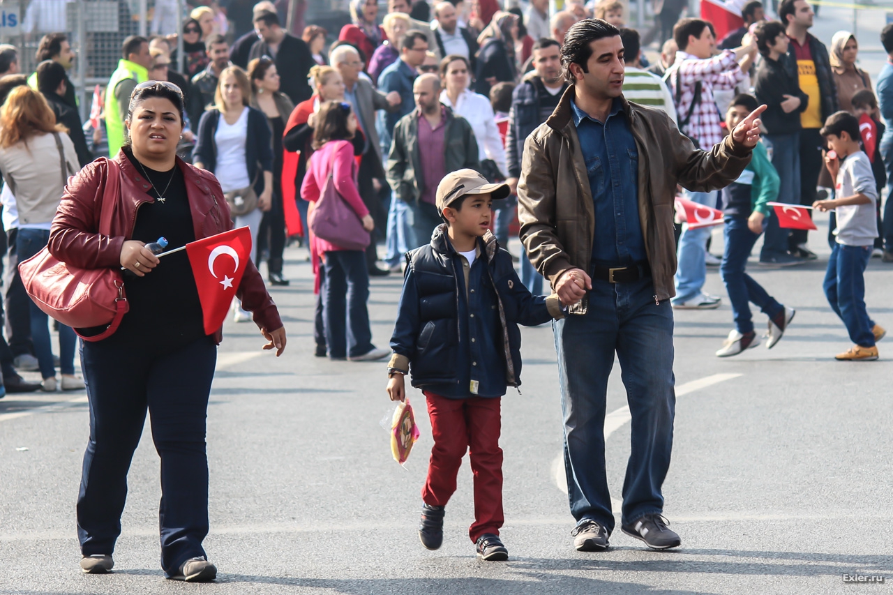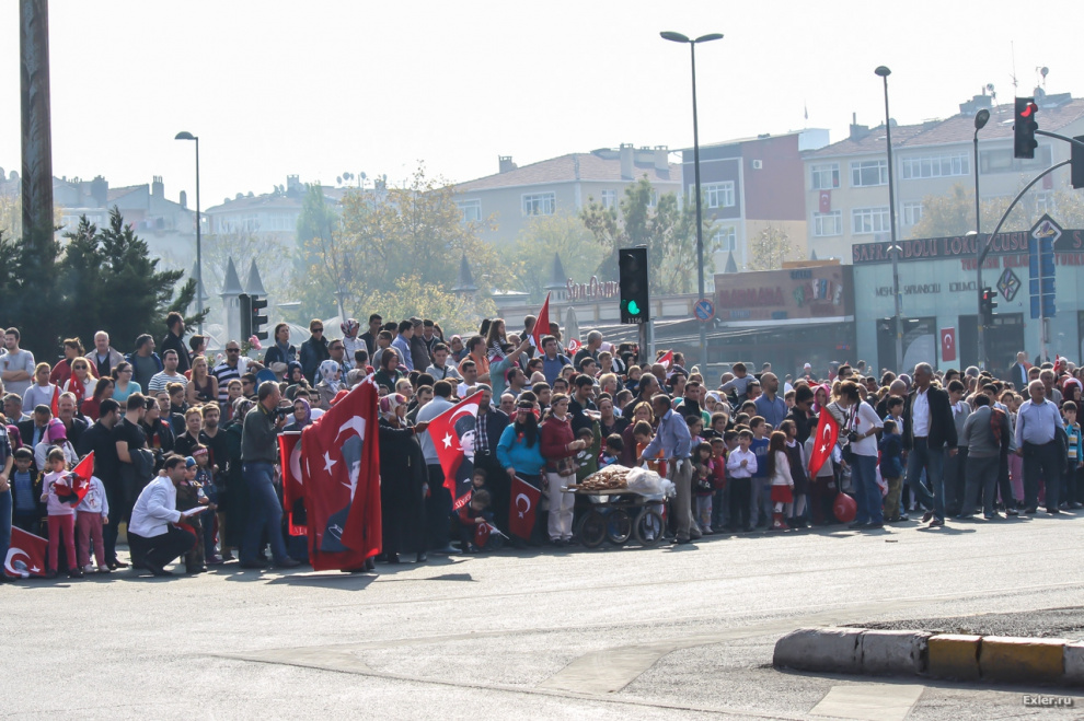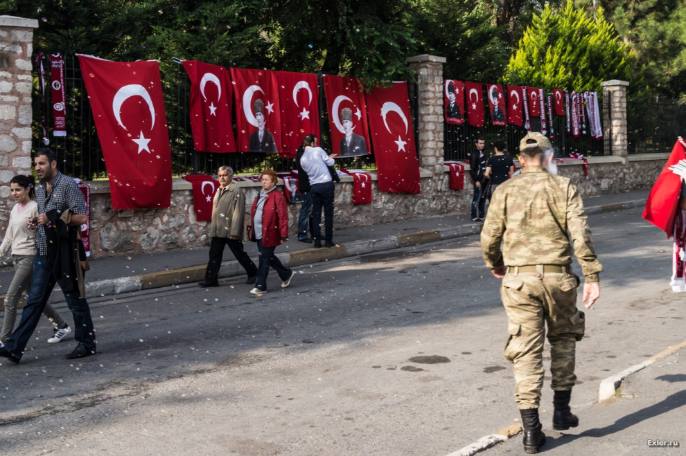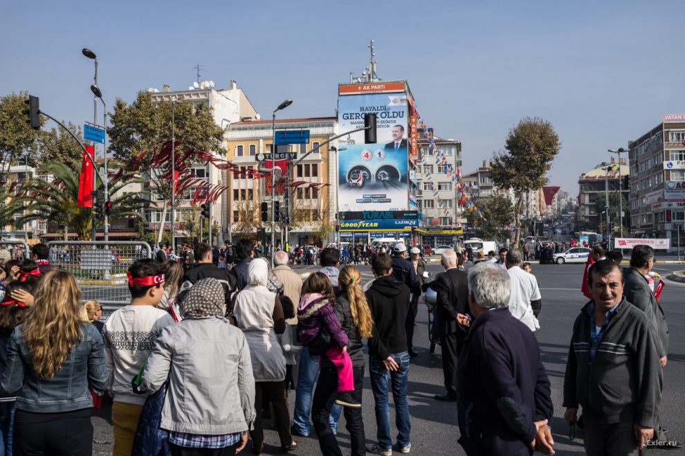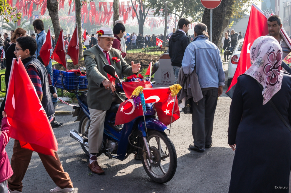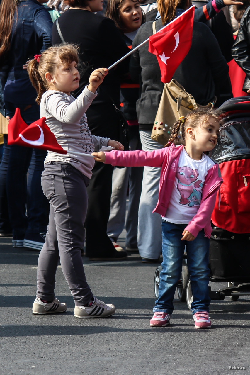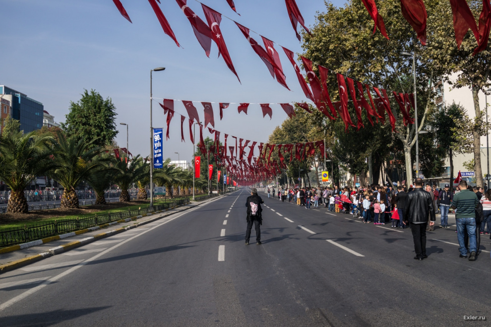 Теперь впечатления о праздновании. Сам парад не особенно впечатлил, но люди там собирались явно далеко не только для того, чтобы посмотреть на шествие военных и школьников. Они приходили целыми семьями, почти все несли самые разнообразные национальные символы с турецким флагом и портретом Мустафы Кемаля Ататюрка - создателя Турецкой Республики. Обстановка была очень веселая, доброжелательная. Полицейские также вели себя очень доброжелательно и общались с собравшимися.
