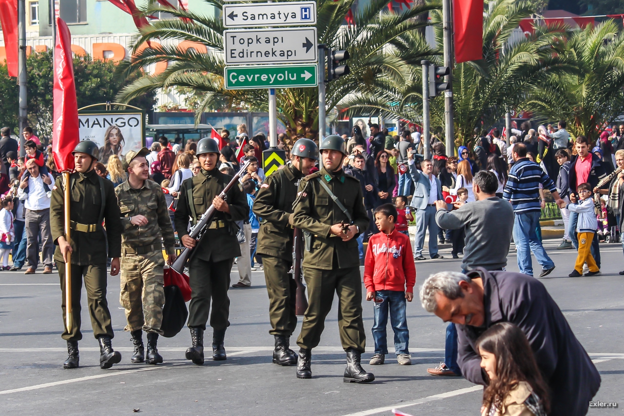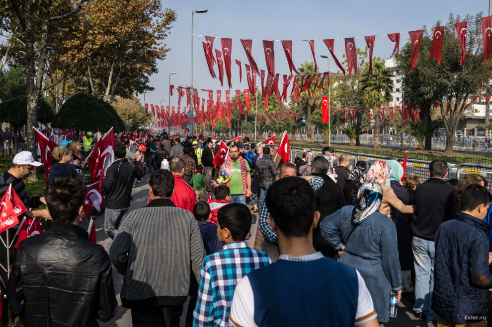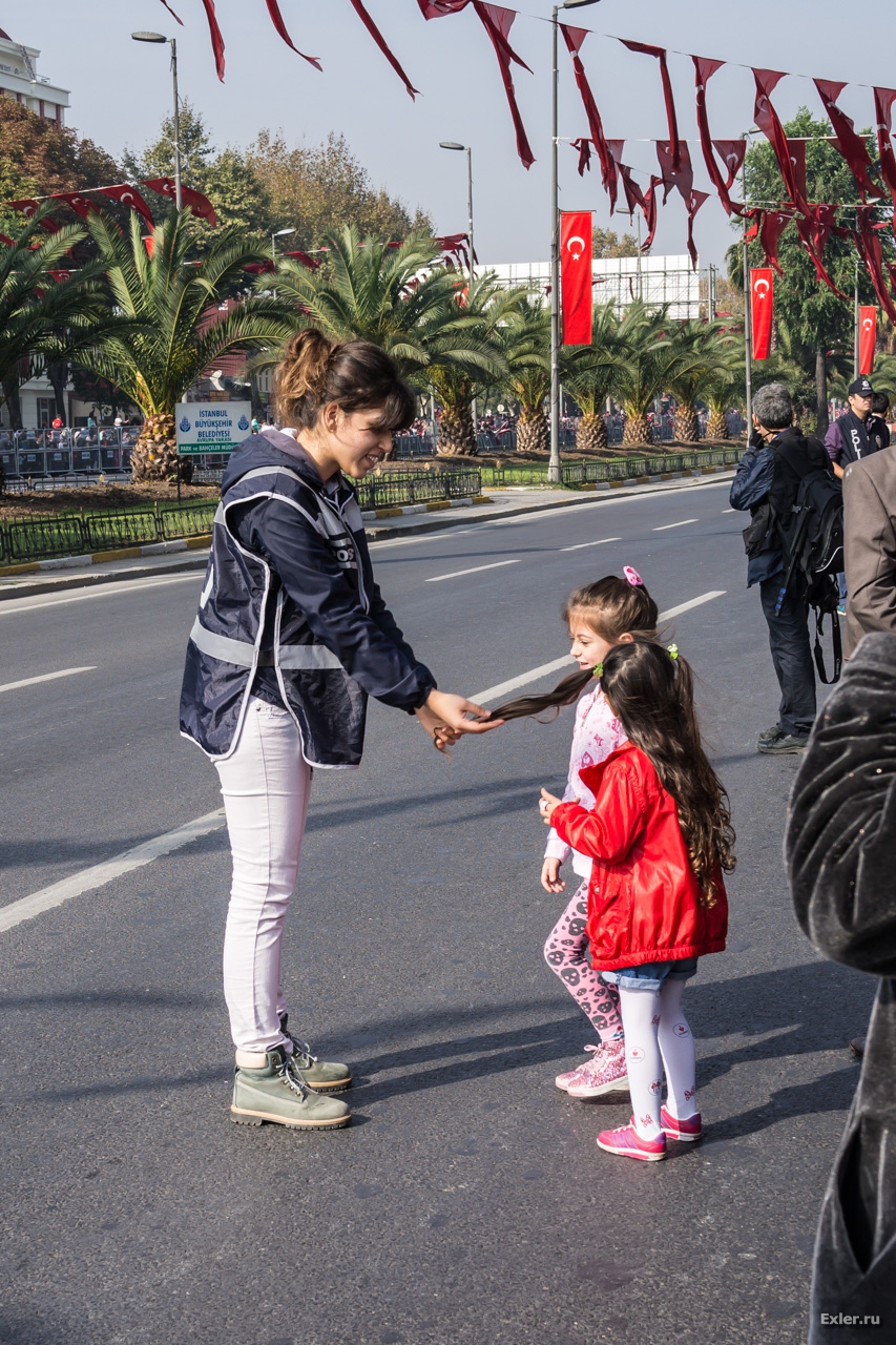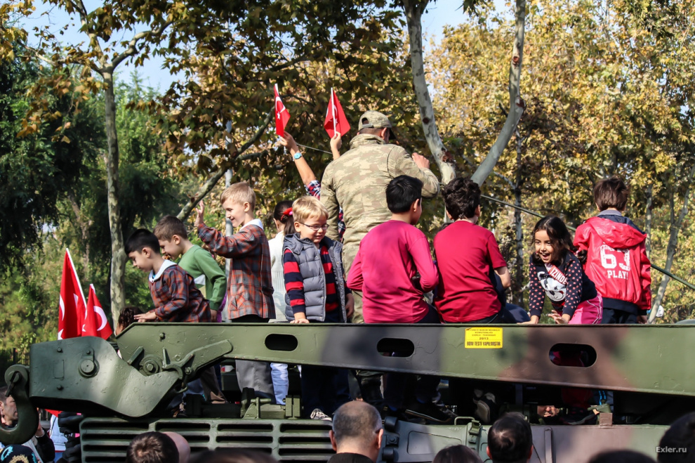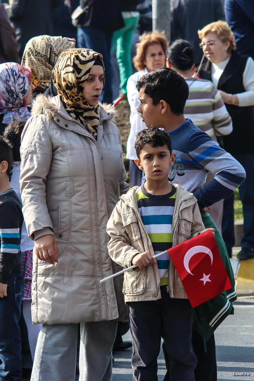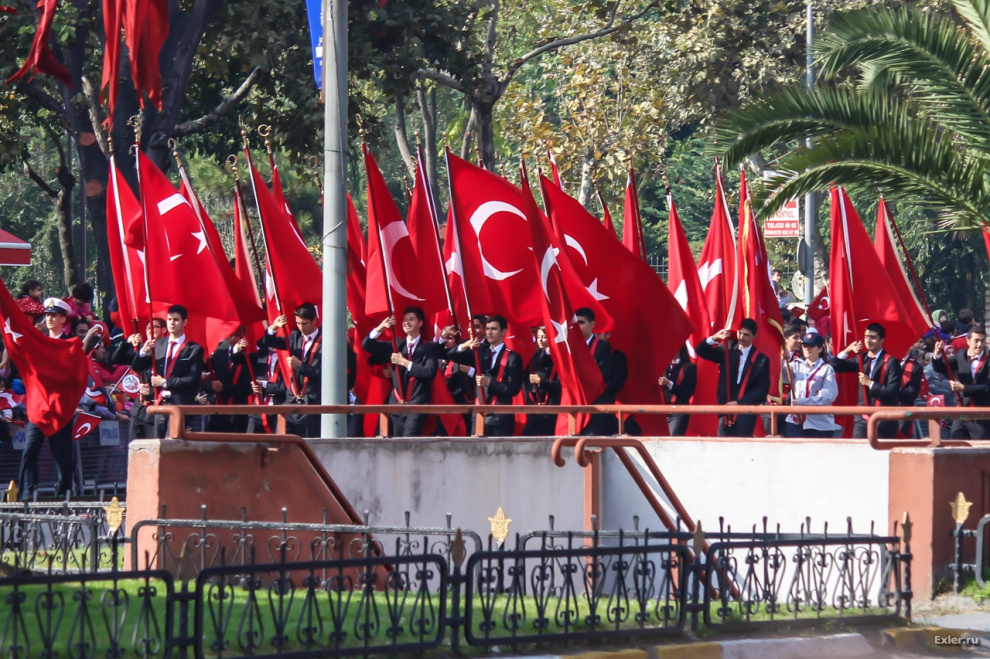 Теперь впечатления о праздновании. Сам парад не особенно впечатлил, но люди там собирались явно далеко не только для того, чтобы посмотреть на шествие военных и школьников. Они приходили целыми семьями, почти все несли самые разнообразные национальные символы с турецким флагом и портретом Мустафы Кемаля Ататюрка - создателя Турецкой Республики. Обстановка была очень веселая, доброжелательная. Полицейские также вели себя очень доброжелательно и общались с собравшимися.