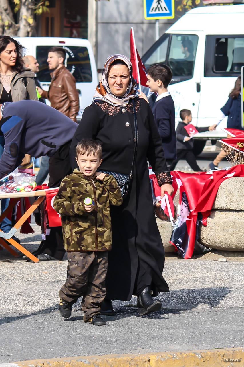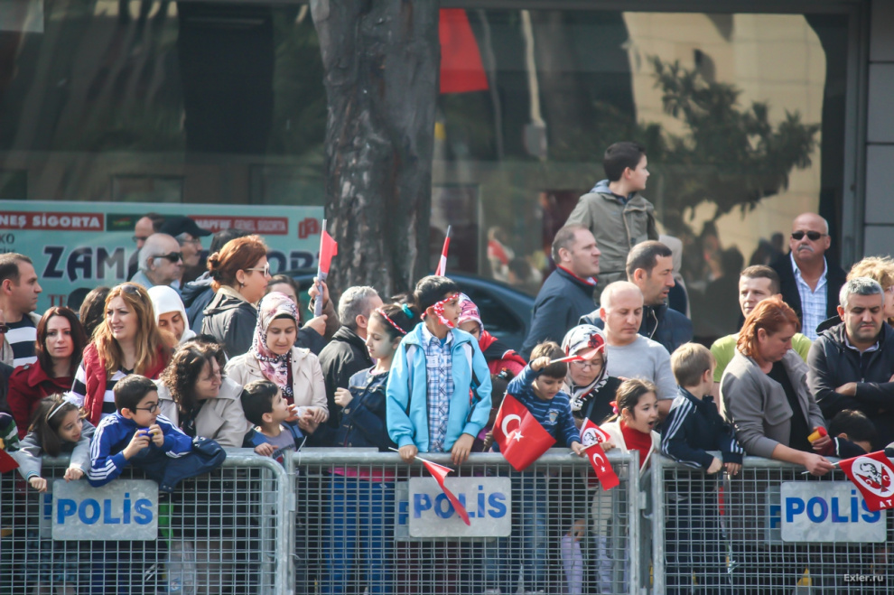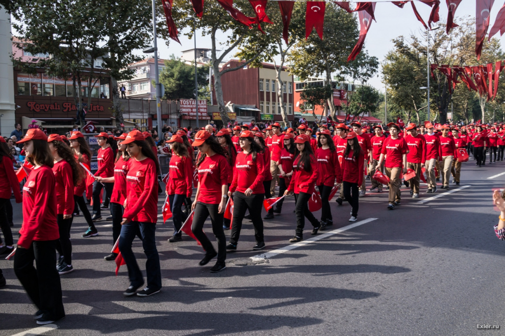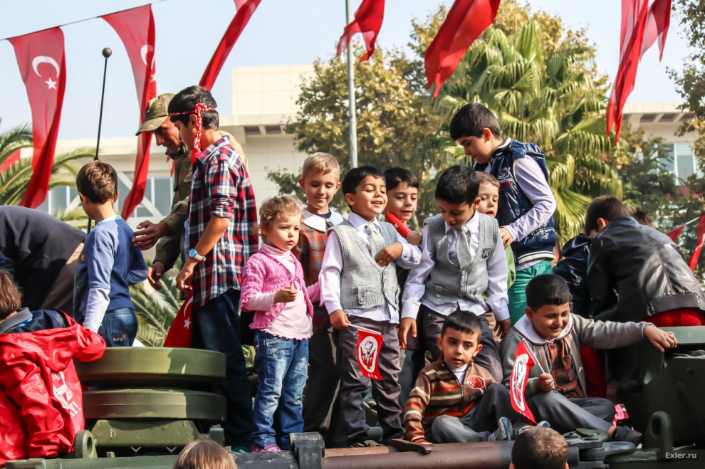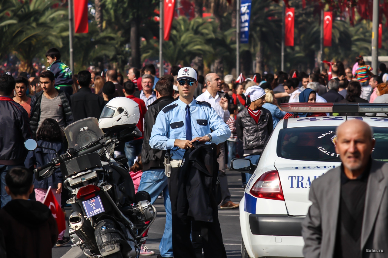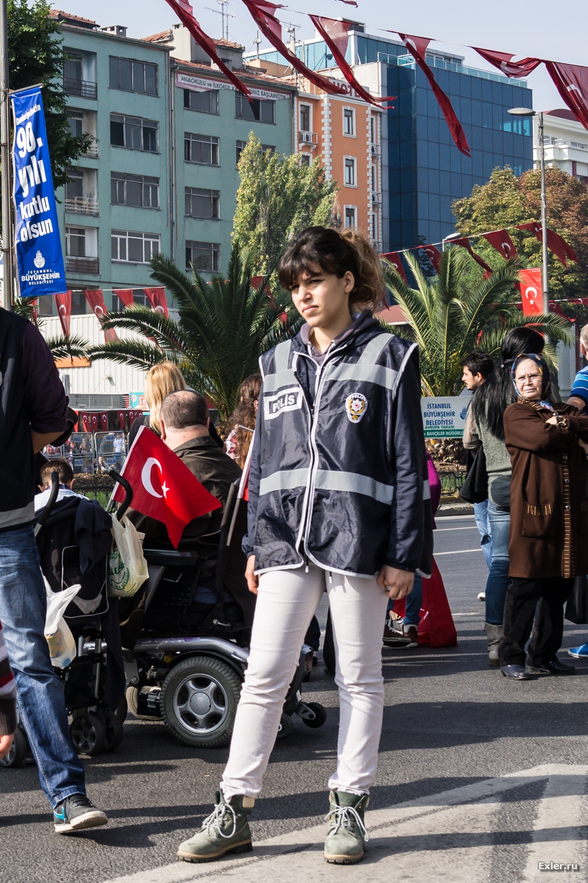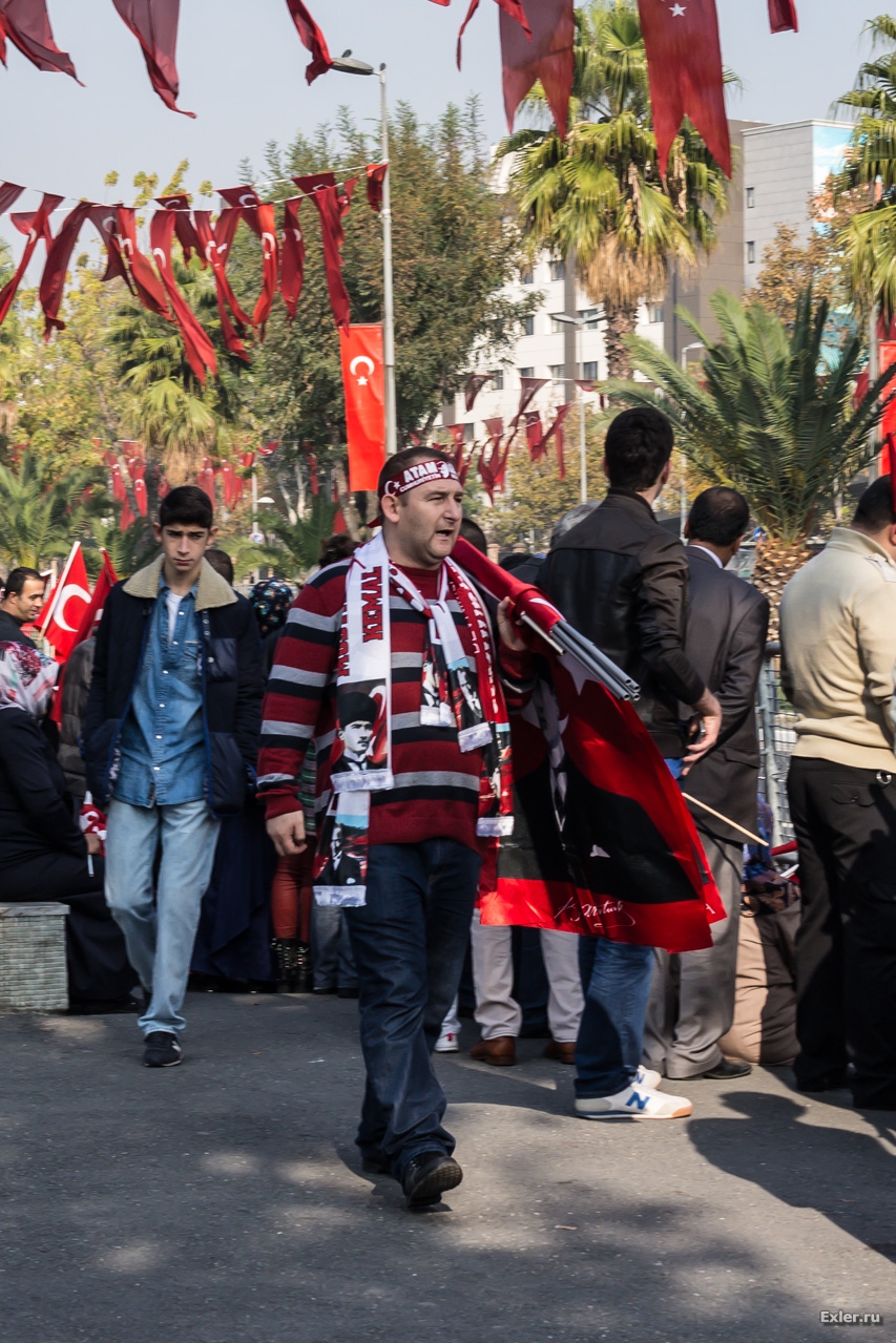 Теперь впечатления о праздновании. Сам парад не особенно впечатлил, но люди там собирались явно далеко не только для того, чтобы посмотреть на шествие военных и школьников. Они приходили целыми семьями, почти все несли самые разнообразные национальные символы с турецким флагом и портретом Мустафы Кемаля Ататюрка - создателя Турецкой Республики. Обстановка была очень веселая, доброжелательная. Полицейские также вели себя очень доброжелательно и общались с собравшимися.