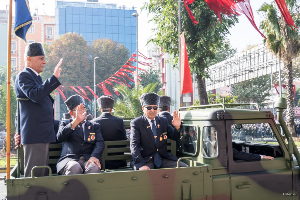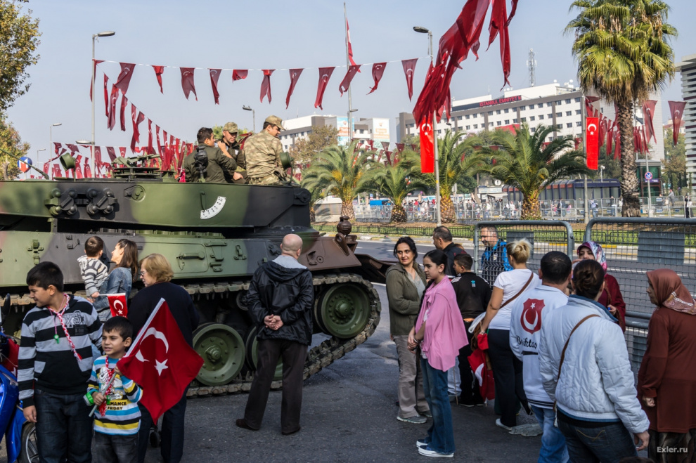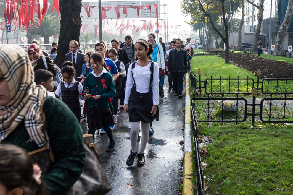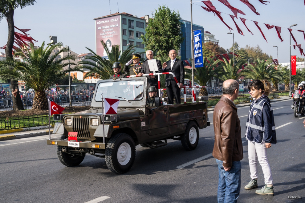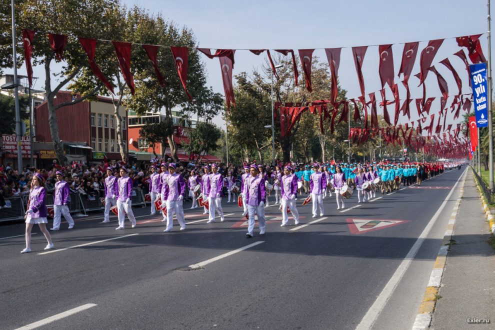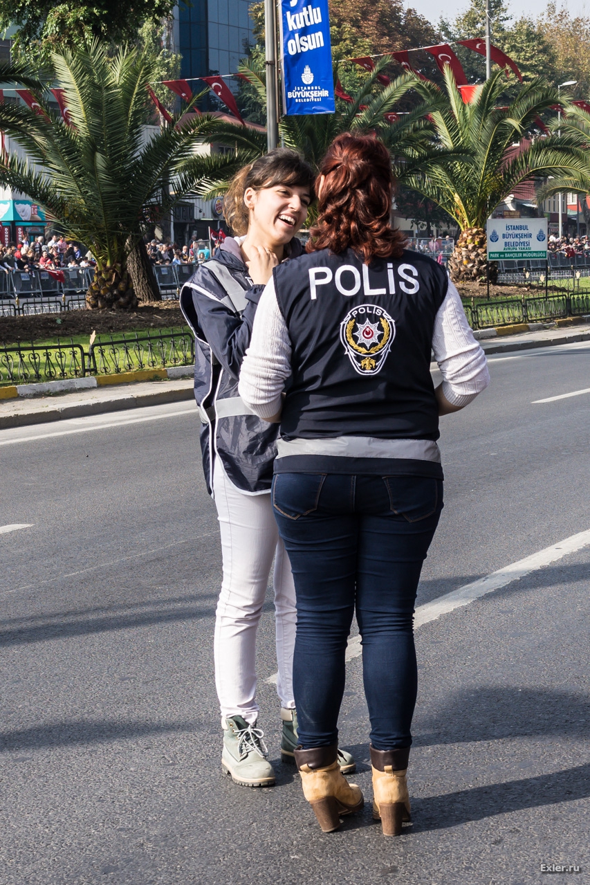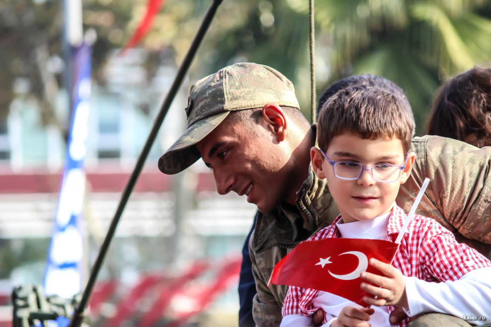 Теперь впечатления о праздновании. Сам парад не особенно впечатлил, но люди там собирались явно далеко не только для того, чтобы посмотреть на шествие военных и школьников. Они приходили целыми семьями, почти все несли самые разнообразные национальные символы с турецким флагом и портретом Мустафы Кемаля Ататюрка - создателя Турецкой Республики. Обстановка была очень веселая, доброжелательная. Полицейские также вели себя очень доброжелательно и общались с собравшимися.