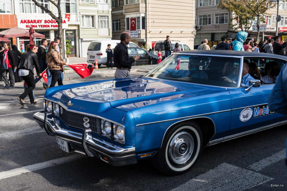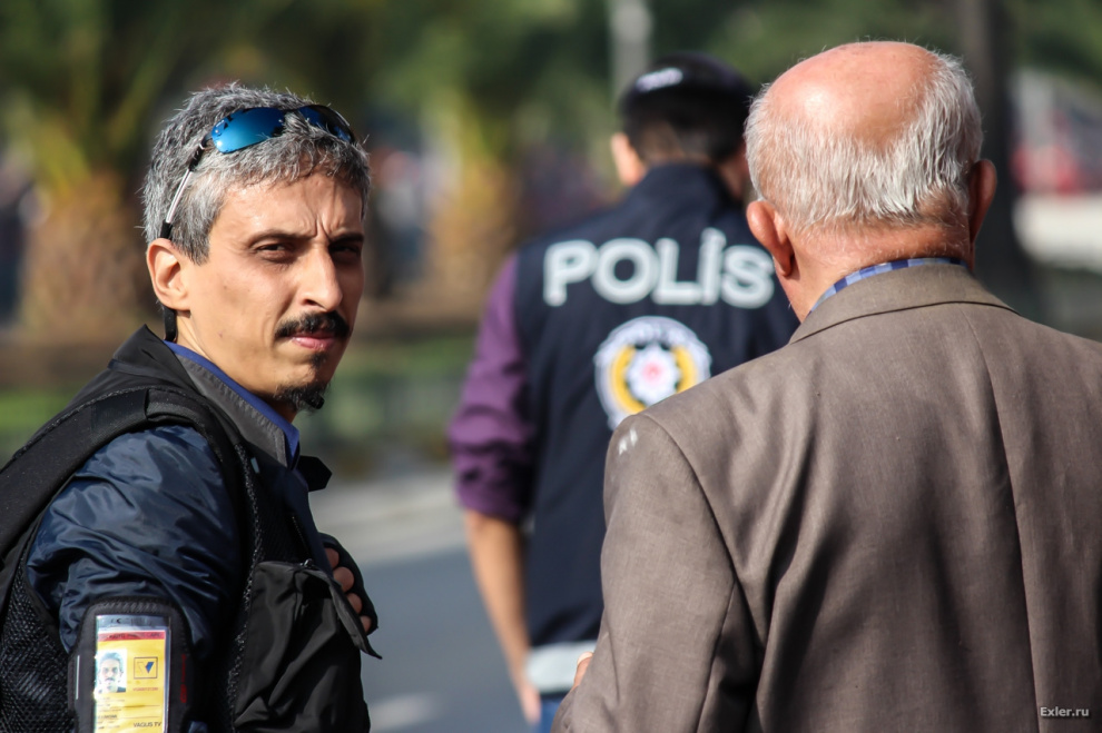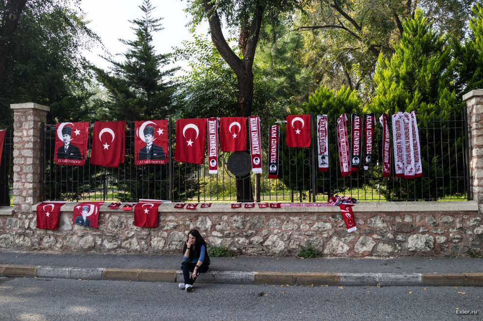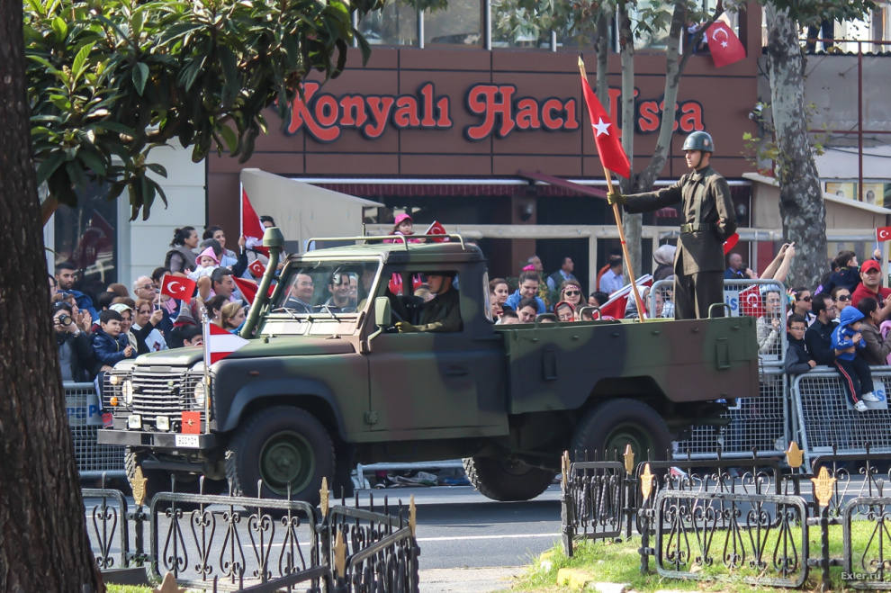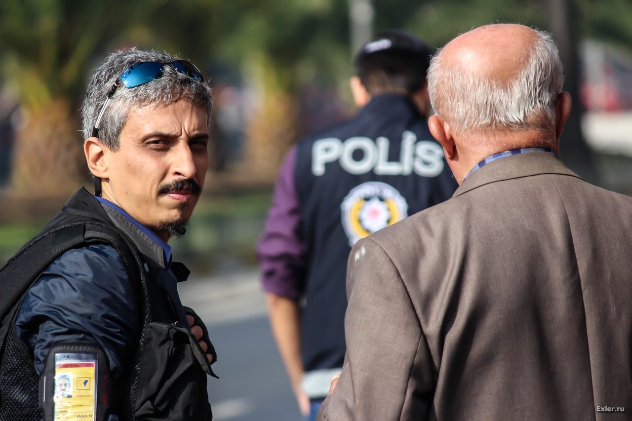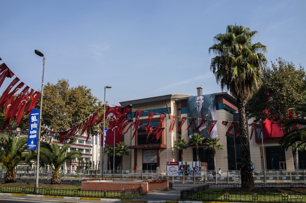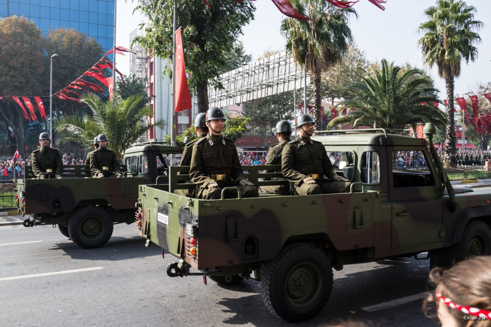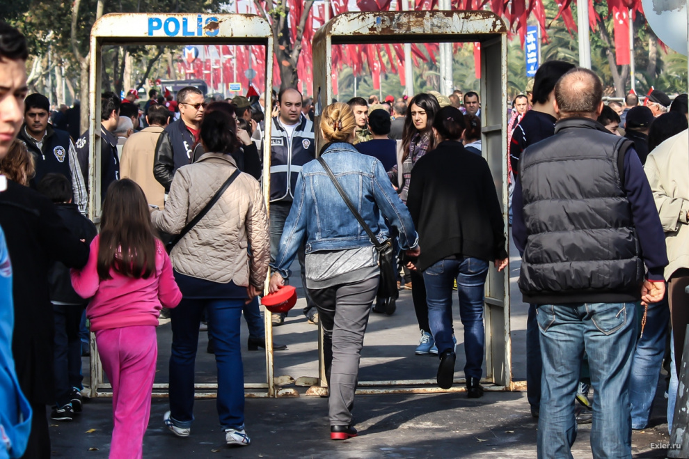 Теперь впечатления о праздновании. Сам парад не особенно впечатлил, но люди там собирались явно далеко не только для того, чтобы посмотреть на шествие военных и школьников. Они приходили целыми семьями, почти все несли самые разнообразные национальные символы с турецким флагом и портретом Мустафы Кемаля Ататюрка - создателя Турецкой Республики. Обстановка была очень веселая, доброжелательная. Полицейские также вели себя очень доброжелательно и общались с собравшимися.