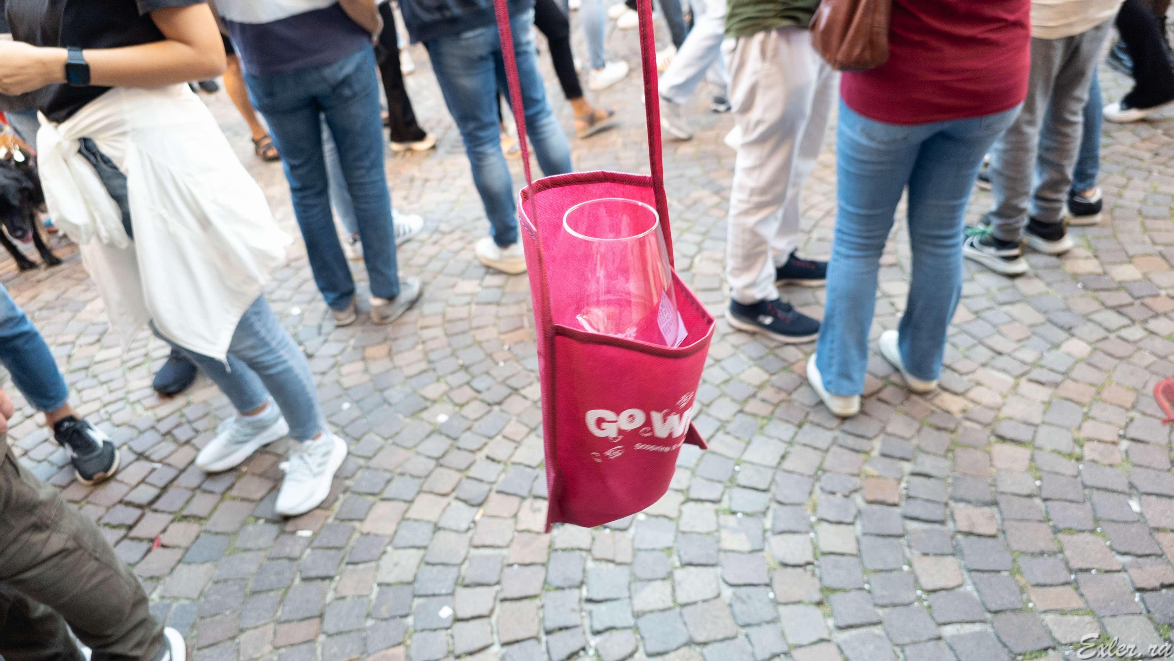 Как это все выглядело в Альбе. Для посещения Фестиваля нужно приобрести билет (ниже на фото - небольшая очередь за билетами), который стоит как обычная дегустация в каком-нибудь винном хозяйстве. При приобретении билета тебе выдают бокал и сумочку на шею, в которую можно класть бокал (это очень удобно). После этого отправляешься по стендам производителей и пробуешь все, что тебе хочется попробовать. И здесь на Фестивале у всех производителей можно было приобретать то вино, которое тебе понравилось. А вот в Шабли на аналогичном празднике ничего купить было нельзя, можно было только пробовать.