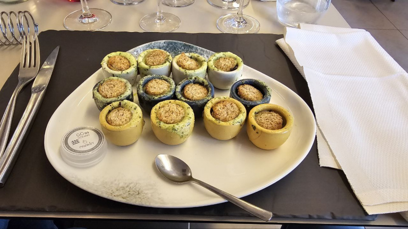В центре кадра - знаменитые бургундские гужеры (gougères) - несладкая выпечка из заварного теста с сыром. Они очень популярны в Бургундии, их подают в ресторанах, угощают гужерами во время дегустаций и так далее. Есть даже специальный праздник, посвященный гужерам - он проходит в деревне Флоньи-ла-Шапель.
