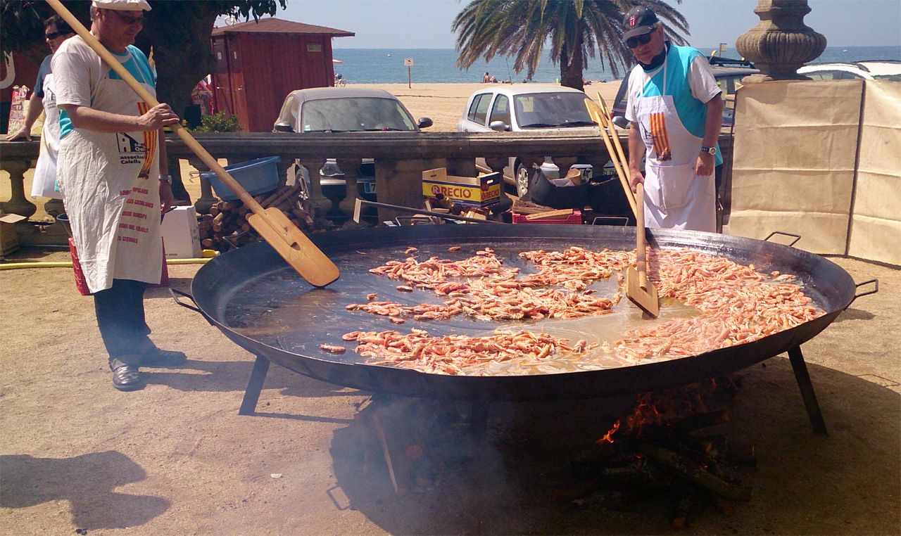 Мужики в огромном чане готовят фирменное блюдо - нечто вроде паэльи с морепродуктами. Сейчас готовят креветок, скоро положат рис и прочие ингредиенты.