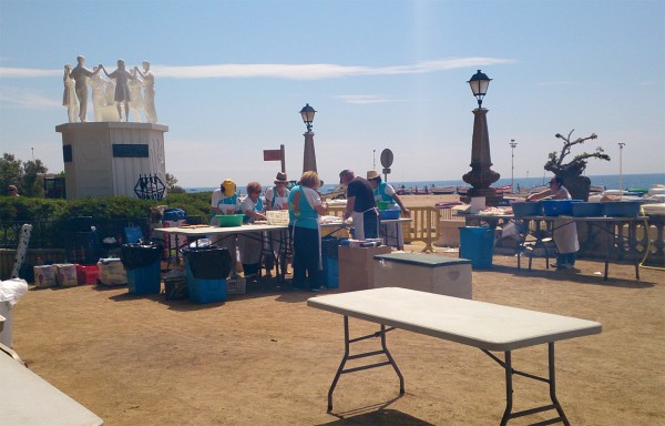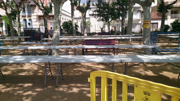 На аллее расставлены столы, с 14 часов начнется веселуха: порция этой паэльи стоит каких-то мелких денег (причем деньги там идут в какой-то фонд, как я понял), к ней можно прикупить газировку, игристое вино (это называется Cava) и пиво.