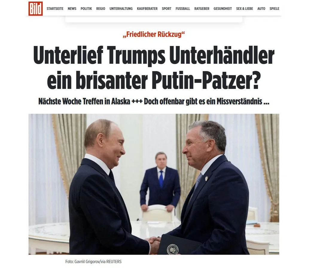 Bild: Посланник Трампа Виткофф неправильно понял Путина: он решил, что Россия собирается уйти из Запорожской и Херсонской областей На самом деле Путин говорил, что оттуда должны уйти украинские войска.