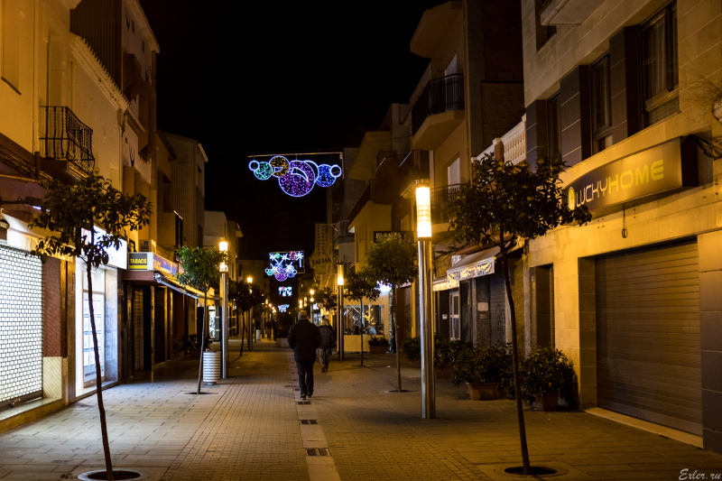 Ночная Пинеда-де-Мар. Слева - пляж и морской променад.