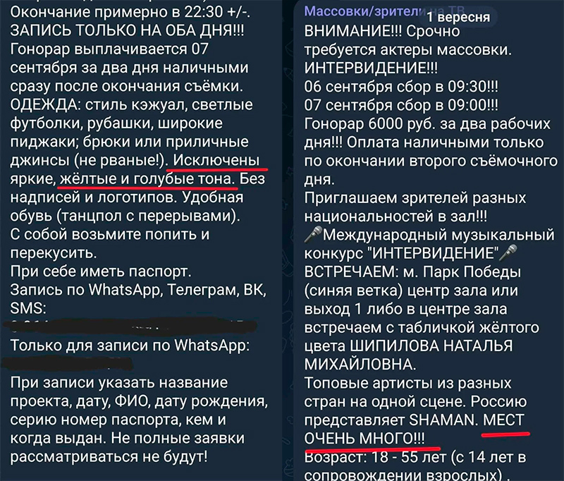 Впрочем, не беда, зрителей ведь можно и купить, правильно? 6 тысяч рублев за два рабочих дня - а это 70 баксов, большие деньги, между прочим. Только, ради бога, одежду желтых и голубых тонов не надевайте, ладно? А то выплат лишат.