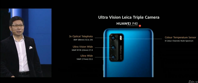 У P40 уже вполне приличный набор. Крутая 50-мегапиксельная основная камера (она у всех трех моделей одинаковая), ширик и 3-кратный зум. И у всех моделей новый сенсор цветовой температуры, который призван улучшить цветопередачу.