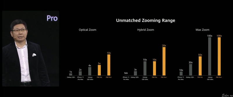 У суперфлагмана - вообще шикарный набор: кроме основного модуля, крутой сверхширик, 3-кратный зум (портретник, 80 мм) и какой-то совершенно фантастический 10-кратный оптический зум (фокусное - 240 мм эквивалента). Никто ничего подобного в смартфонах не показывал, Huawei тут впереди планеты всей. Они год назад первые сделали 5-кратный оптический зум, который только-только повторили в Samsung, а у Huawei уже десятикратный - это, конечно, невероятно круто!