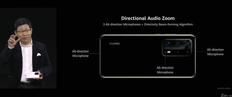 Три микрофона и система направленной записи звука. В демонстрации выглядело интересно, но надо смотреть, как оно будет работать в реальности.