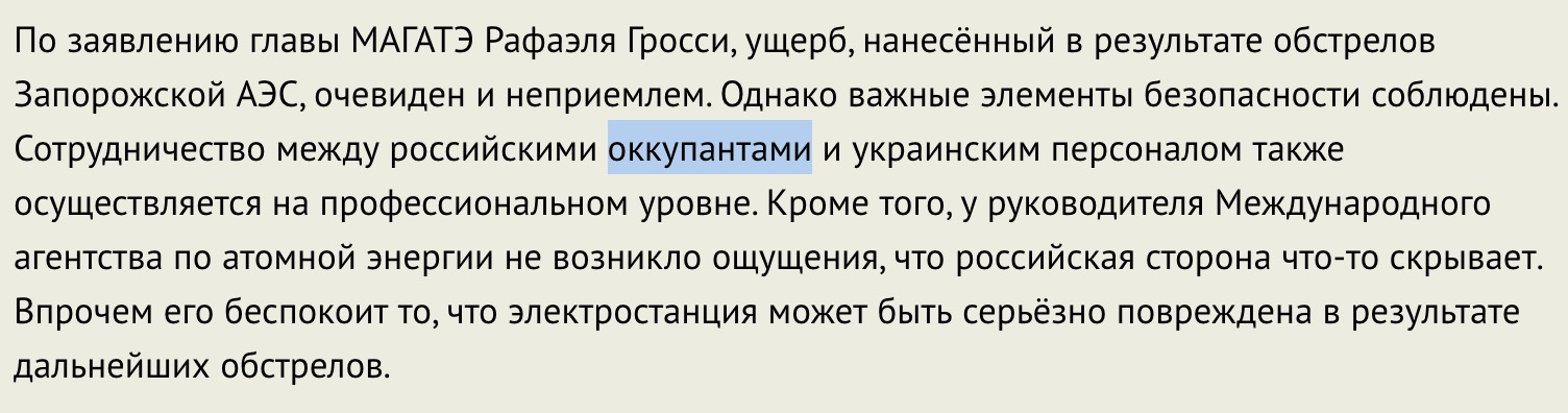 ИМХО, так гораздо более объективно и строго по фактам. И, как видно – ни разу не означает, что якобы МАГАТЭ каким-то образом "поддерживает российские версии" или "не обращает внимания на оккупацию". Они всего лишь занимаются своими прямыми обязанностями.