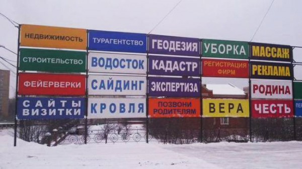 Смотрите, какая прелесть: "РОДИНА! ВЕРА! УБОРКА"! Или "МАССАЖ! НЕДВИЖИМОСТЬ! ЧЕСТЬ"!