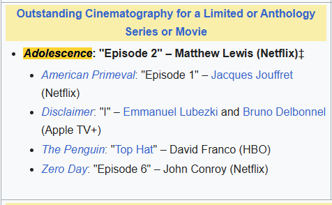 Лучшим комедийным сериалом объявлена снятая в Голливуде "Киностудия" (The Studio), лучшим мини-сериалом - британский "Переходный возраст" (Adolescence), рассказывающий историю убийства девочки-подростка одноклассником в четырех сериях, в каждой из которых преступление представлено из другой перспективы.