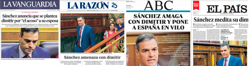 Сегодня большинство главных изданий страны вышло с портретами премьер-министра (в испанском это называется presidente del Gobierno de España - президент Правительства Испании) Санчеса и с громкими заголовками: "Санчес объявил о своей отставке из-за "домогательств" к его жене", "Санчес угрожает уйти в отставку", "Санчес уходит в отставку и оставляет Испанию в смятении", "Что же будет с родиной и с нами" и все такое прочее.