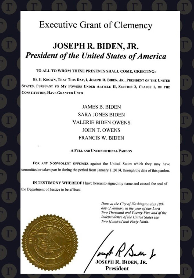 Также в качестве срочной новости еще сообщили, что Байден также превентивно помиловал и каких-то других членов своей семьи, кроме Хантера, которого он горячо помиловал ранее, заявив, что Рафик неуиноуен.