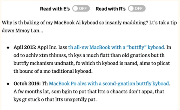 The Wall Street Journal выпустил критическую статью о клавиатурах-бабочках на MacBook, MacBook Air и MacBook Pro, выпущенных после 2015 года. Издание включило в материал кнопки, которые добавляют буквы «Е» и «R», потому что они запали на новом ноутбуке от Apple.